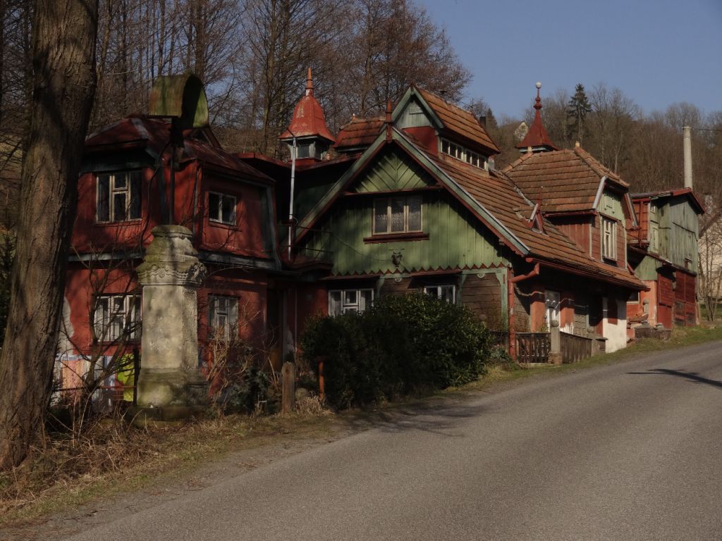 Nepřehlédnutelný Škodův dům čp. 129 stojí při hlavní silnici, zhruba uprostřed obce, blíže jejímu dolnímu konci. Do své dnešní, bizarní podoby jej přestavěli jeho majitelé – zruční truhláři a tesaři – v období mezi světovými válkami.